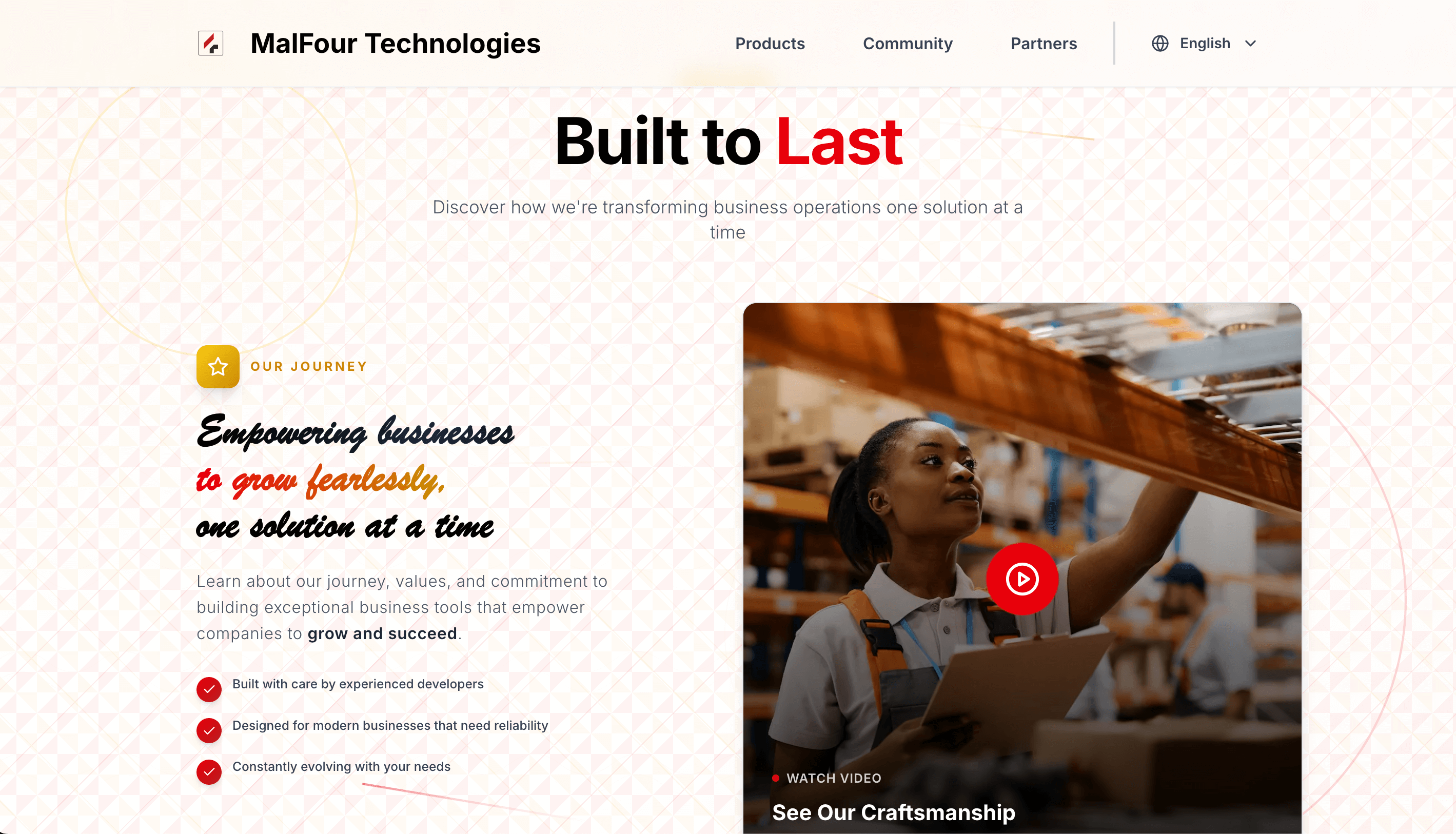 A homepage that tells the story of how Malfour supports inventory, sales, and customer relationships in one place.