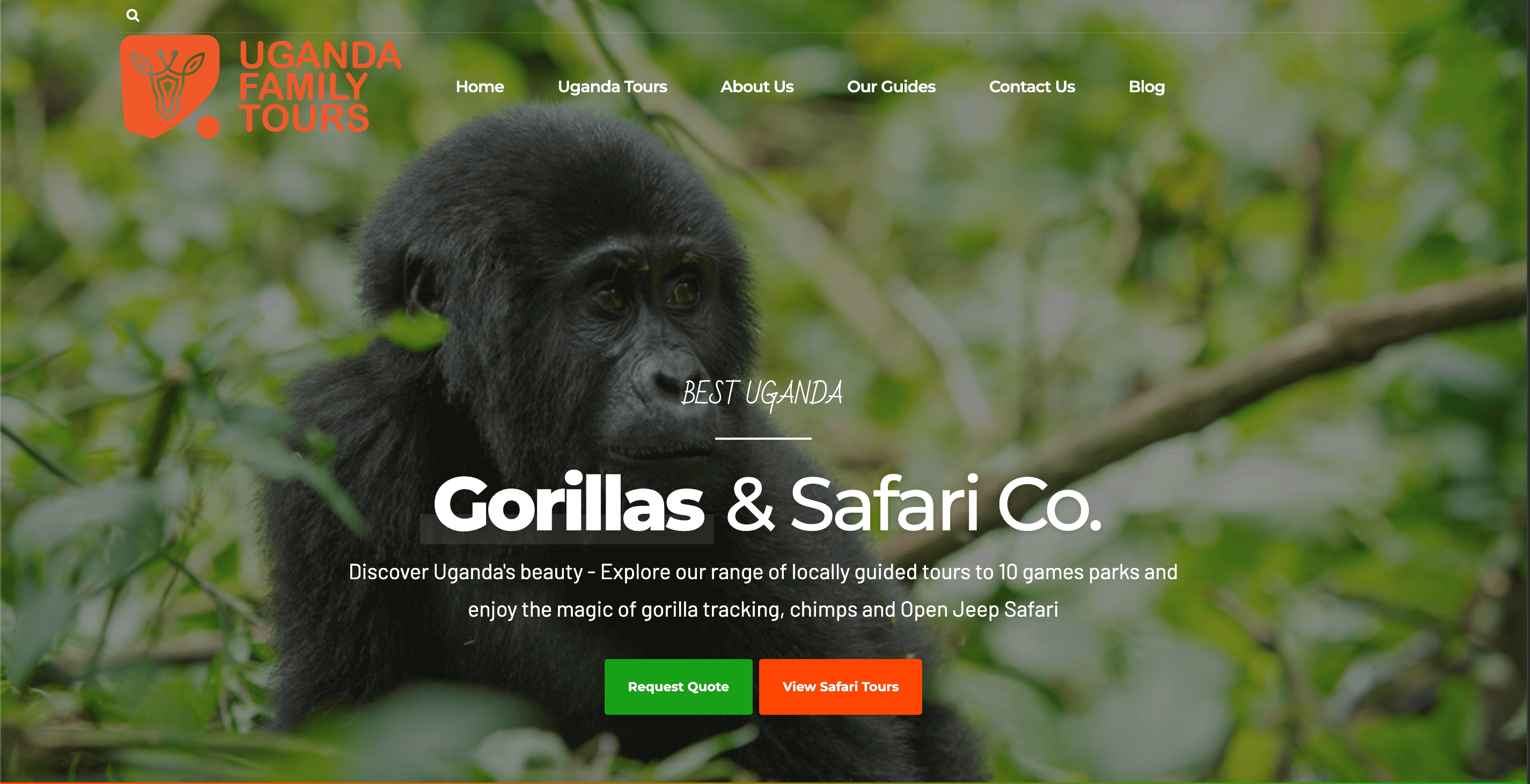 Stunning full-screen hero section with slideshow of Uganda's wildlife and landscapes, clear value proposition ('Best Uganda Gorillas & Safari Co.'), and prominent 'Request Quote' and 'View Safari Tours' CTAs.